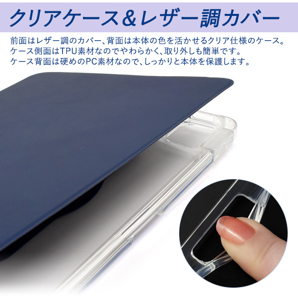 前面はレザー調のカバー、背面は本体の色を活かせるクリア仕様のケースです。