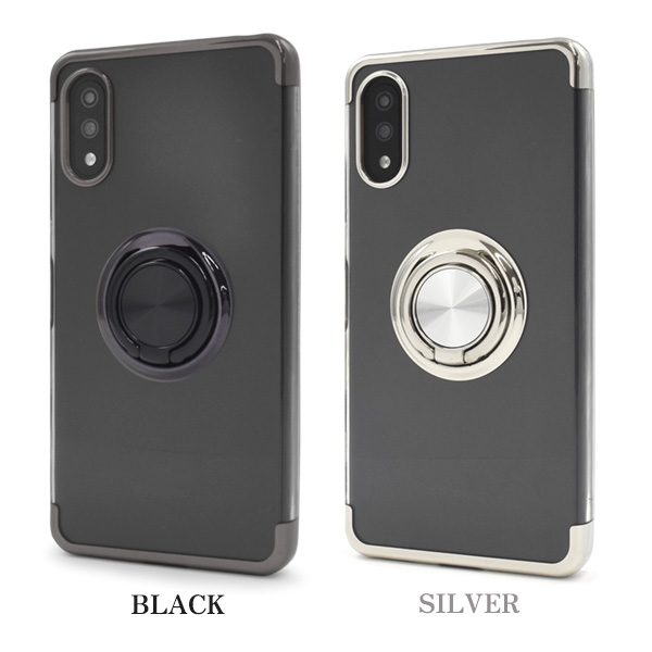 落下防止用のスマホリングが付いた、メタルカラーバンパーソフトクリアケースです。
