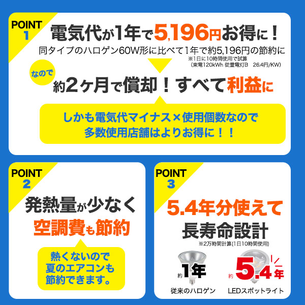 従来の同タイプハロゲン60W形から変更することで、電気代は1ヶ月で約433円もお得になります。 約2ヶ月で償却でき、それ以降はすべて利益になります。 (1kw=26.4円にて計算)