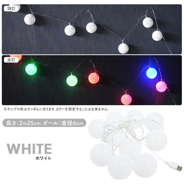 ころころとした見た目♪ USB電源式 コットンボール ランプ ホワイト/カラフル