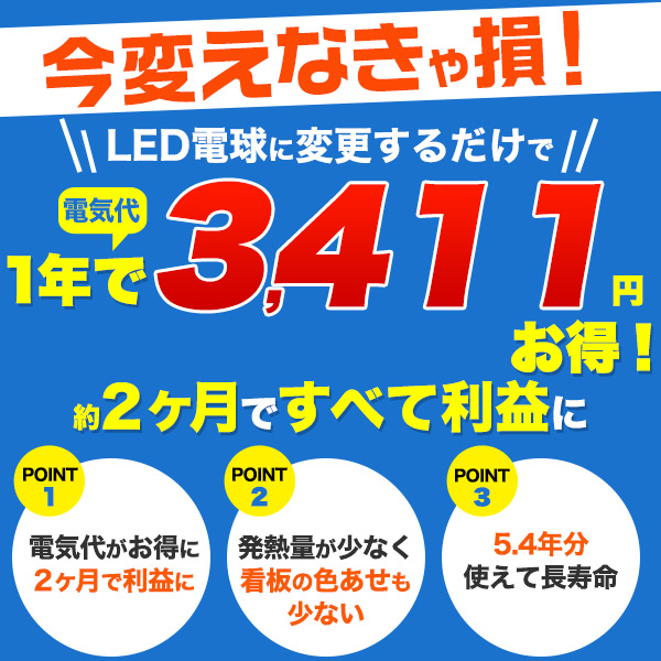 従来の同タイプ40W形一般電球から変更することで、電気代は1年で約3411円もお得になります。 約2ヶ月弱で償却でき、それ以降はすべて利益になります。 (1kw=26.4円にて計算)