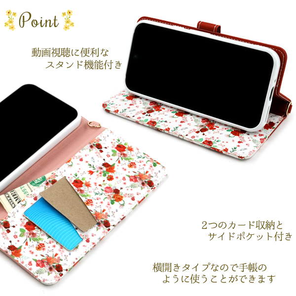 ユリやバラなど女性に人気の花を集めた、ハッピーブーケ手帳型ケース。