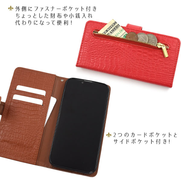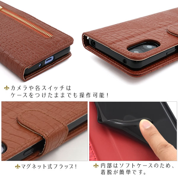 クロコダイルレザーデザインの手帳型ケース。