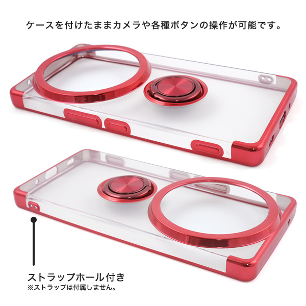 落下防止用のスマホリングが付いた、メタルカラーバンパーソフトクリアケースです。