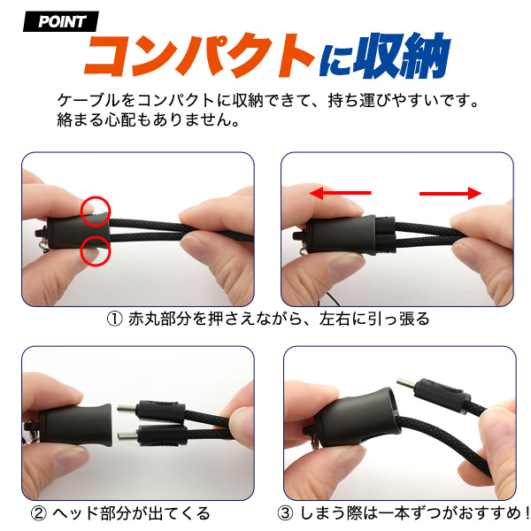 | 注意事項 | ★オリジナル商材用素材アイテムですので、特にパッケージはございません。 ※すべての機種への充電/転送を保証するものではありません。ご使用の機種によっては使用できない場合があります。 ※アダプタ・スマホ・iPadなどは付属しません。 ※ストラップ部分にしまう際は、ケーブルを1本ずつ入れてください。 |