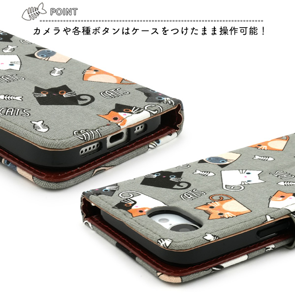 食いしん坊な猫ちゃん達を全面にプリントした生地を使用した手帳型ケースです。