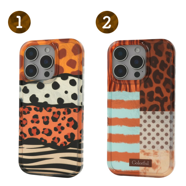 さまざまな動物の柄がミックスされたスマホケース。