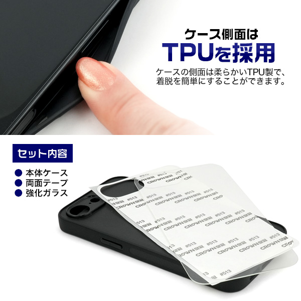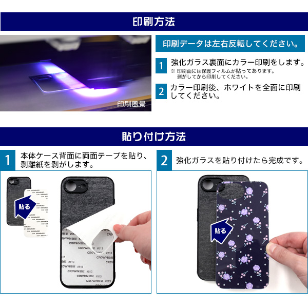 強化ガラスの裏面に反転したデータを印刷し、印刷面をケースに貼り付けるため、摩擦による印刷落ちの心配がなく、素材の光沢感を活かせるケースです。