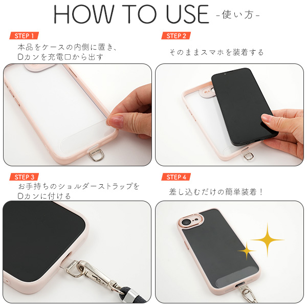 | 注意事項 | ★素材パーツの為、パッケージ、取説等はございません。 ※ストラップ類、スマホ、スマホケースは付属しません。 ※スマートフォンケース専用です。 ※本来の目的以外でのご使用はおやめください。事故や破損の原因になります。 ※ケースによってはストラップホルダーを装着したままケーブル充電ができない場合があります。 |