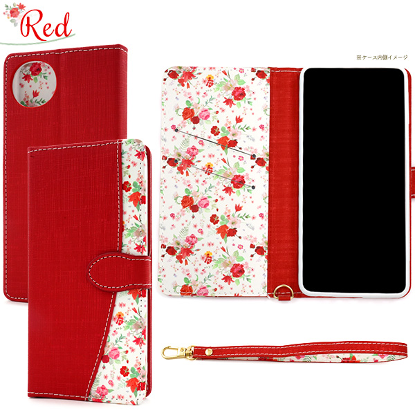 ケースと同色の、裏地にさりげなく花柄が覗くおしゃれなデザインのストラップです。